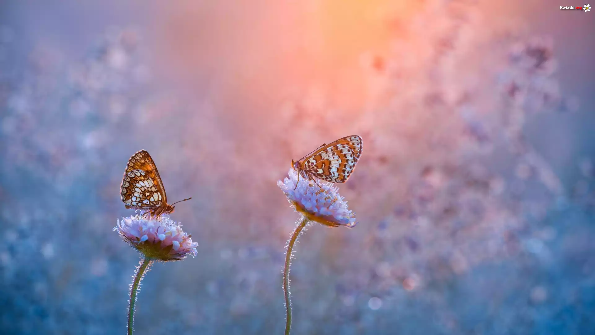 Dwa, Motyle, Przeplatka didyma, Kwiaty, Świerzbnica polna, Rozmyte tło - Zdjęcia