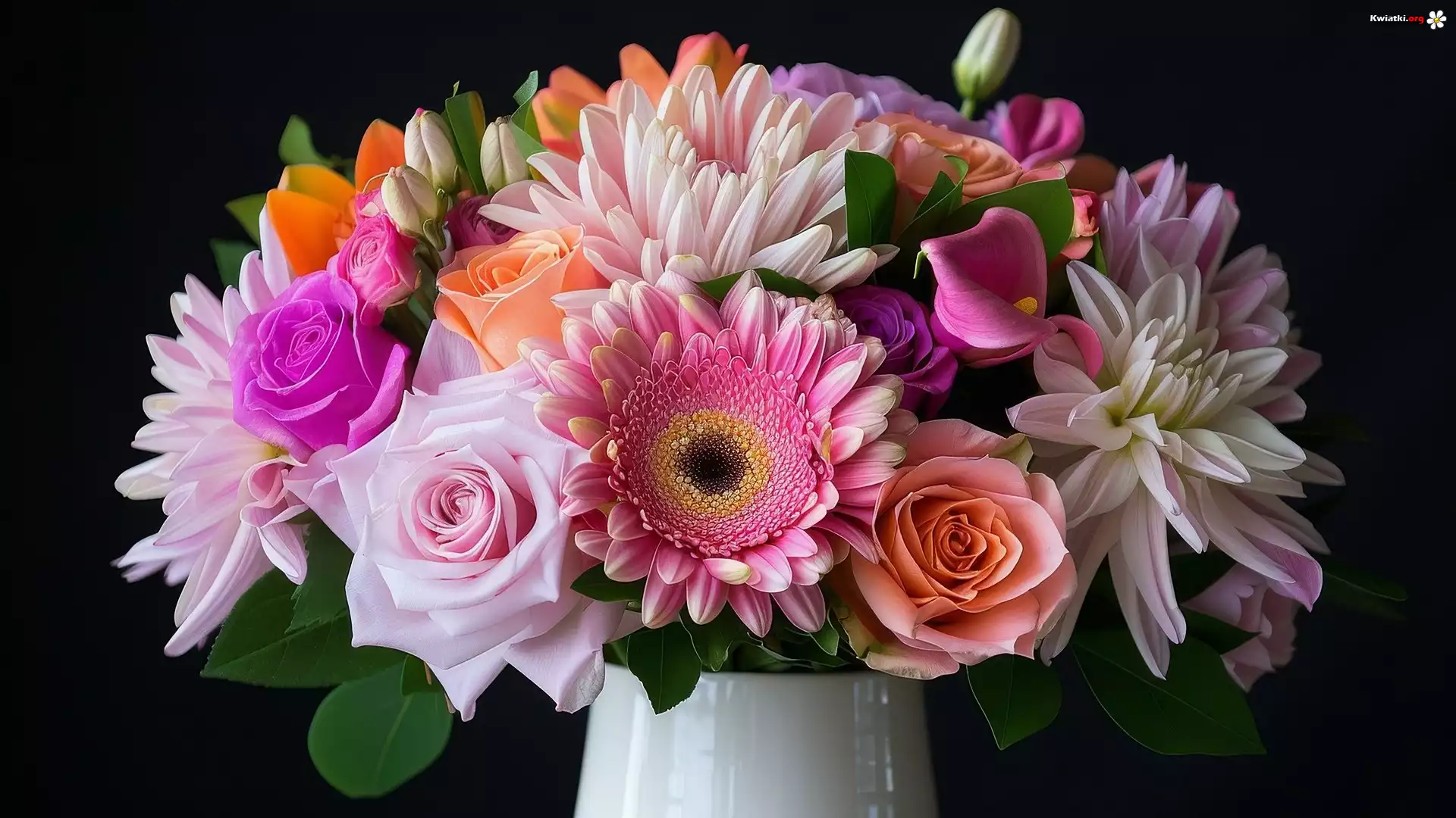 Bukiet Kwiatów, Róże, Gerbery, Dalie, Wazon, Czarne, Tło - Zdjęcia