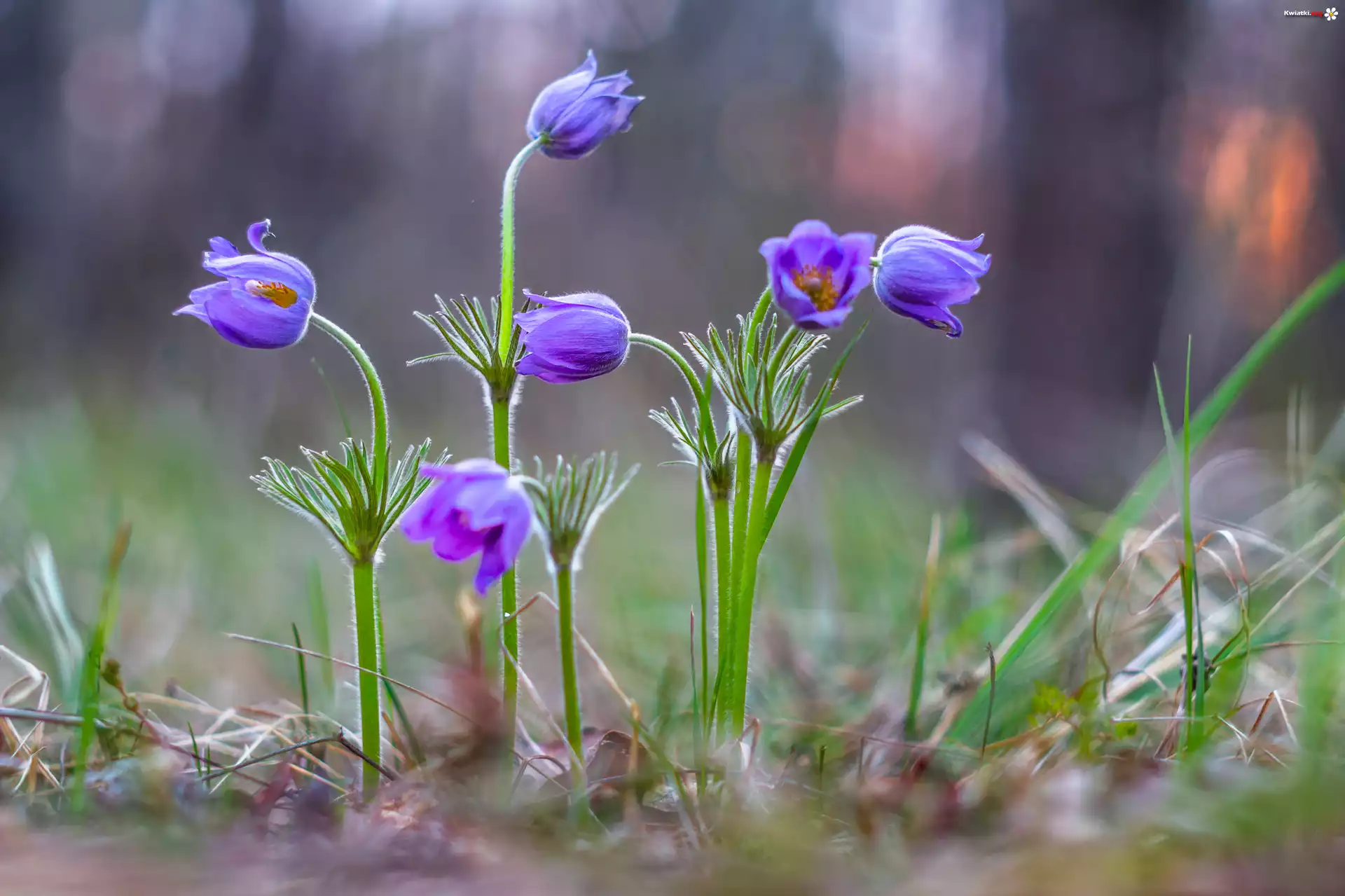 Kwiaty, Trawa, Fioletowe, Sasanki - Zdjęcia