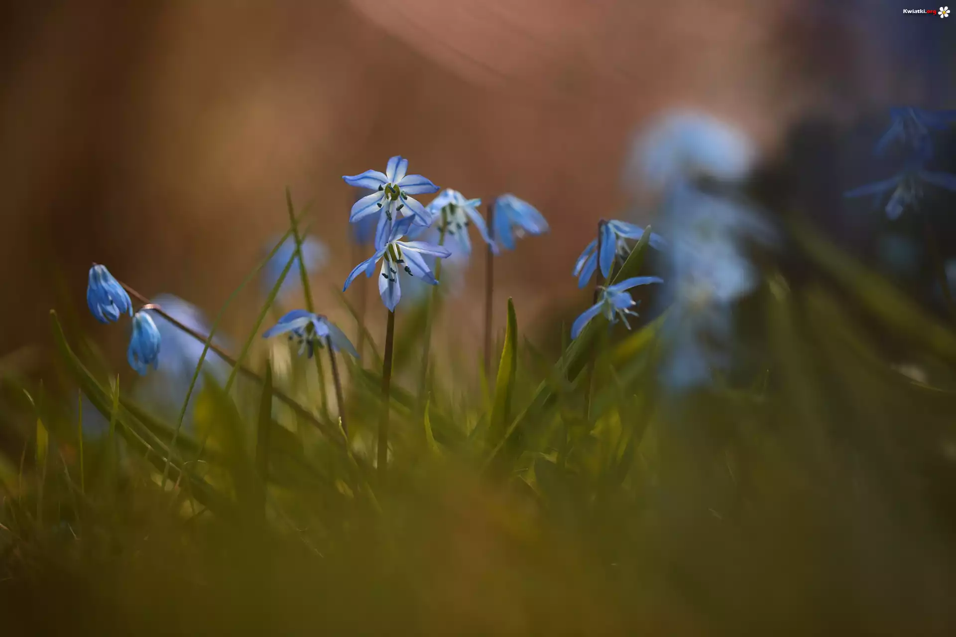 Cebulice syberyjskie, Niebieskie, Kwiaty, Trawa - Zdjęcia