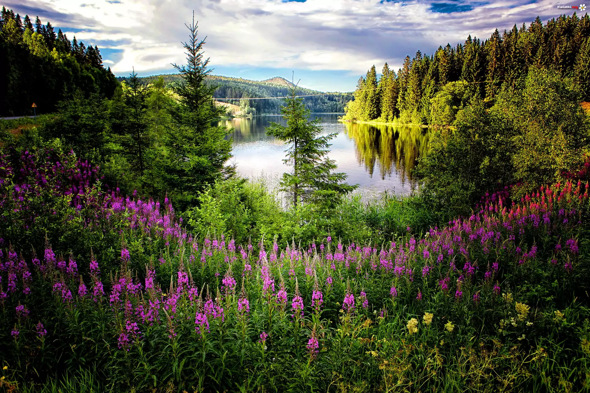Kwiaty, Trawa, Rośliny, Drzewa, Jezioro, Wzgórza, Niebo, Chmury - Zdjęcia
