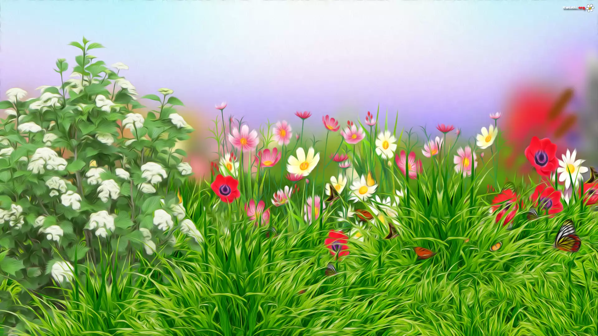 Trawa, Kwiaty, Krzew, Farba olejna - Zdjęcia