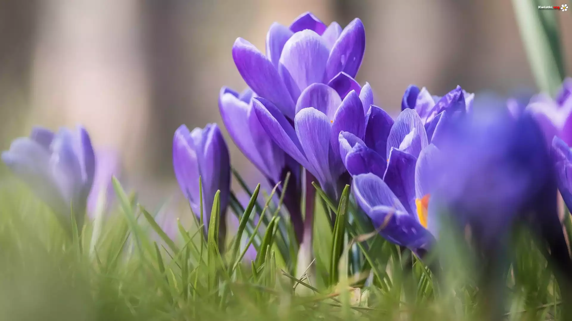 Fioletowe, Kwiaty, Krokusy, Trawa - Zdjęcia
