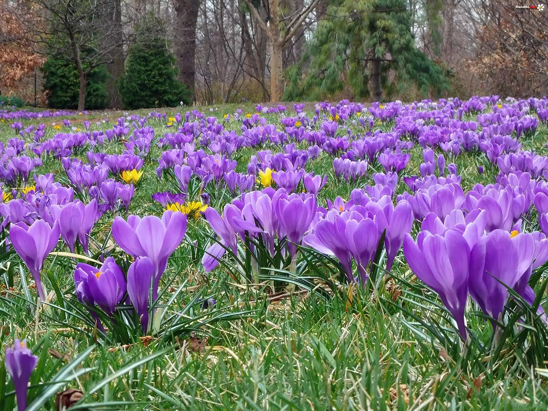 Krokusy, Trawa, Drzewa - Zdjęcia