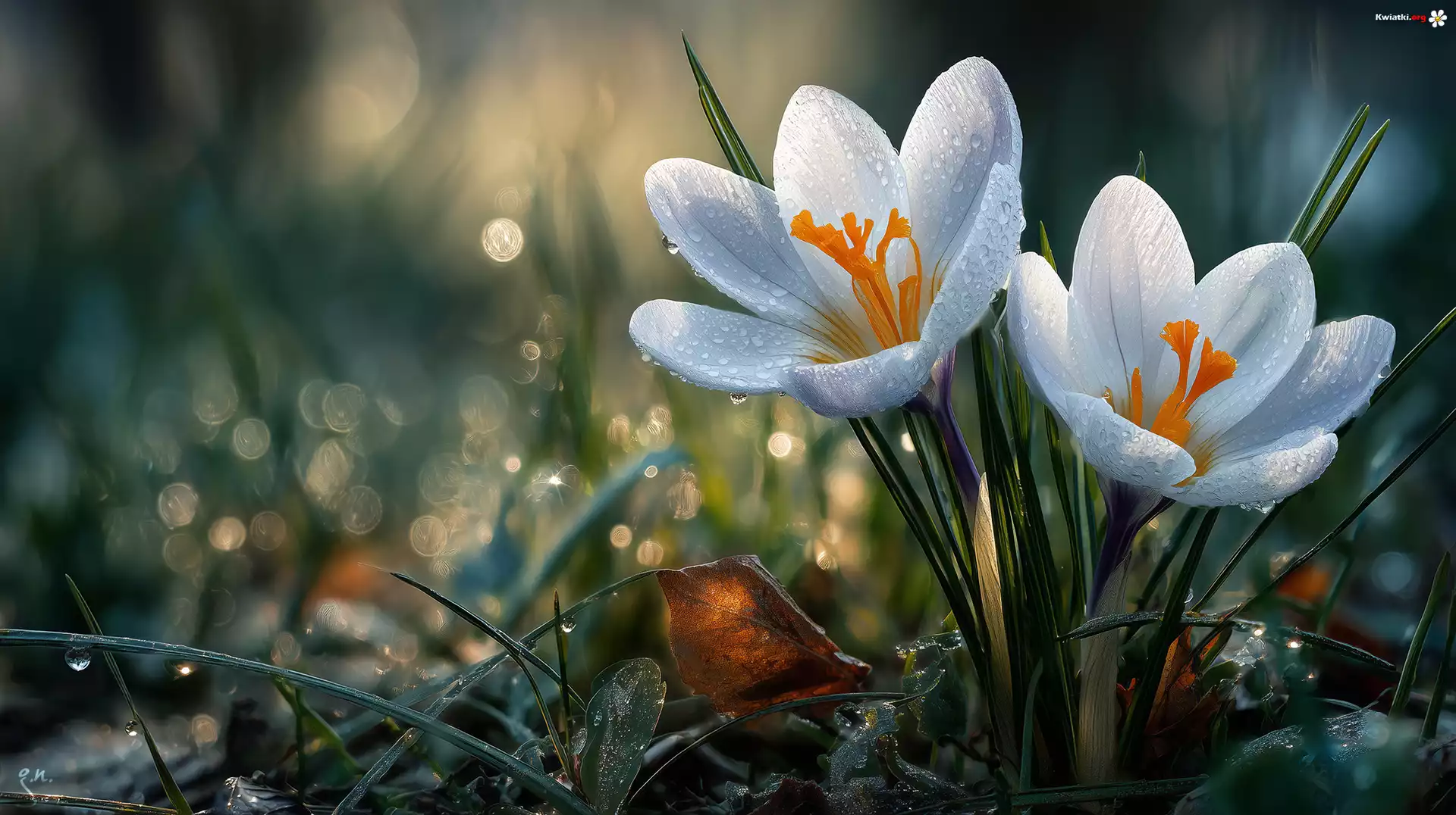 Kwiat Białe, Krokusy, Kwiaty, Trawa, Krople, Grafika AI