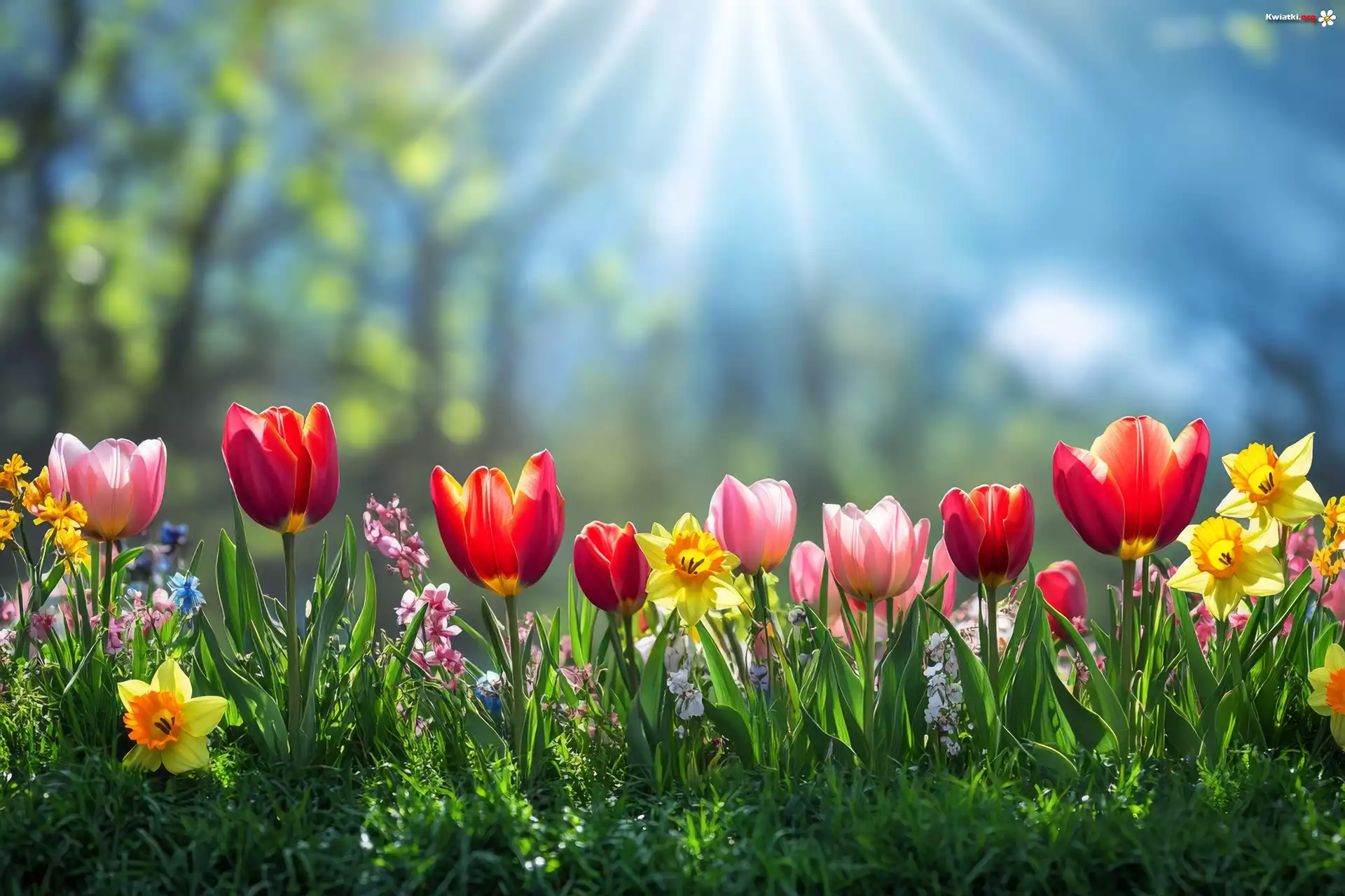 Tulipany, Narcyzy żonkile, Trawa, Grafika, Kwiaty - Zdjęcia