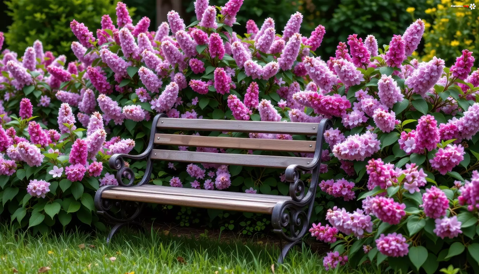Ławka, Różowe, Kwiaty, Trawa - Zdjęcia