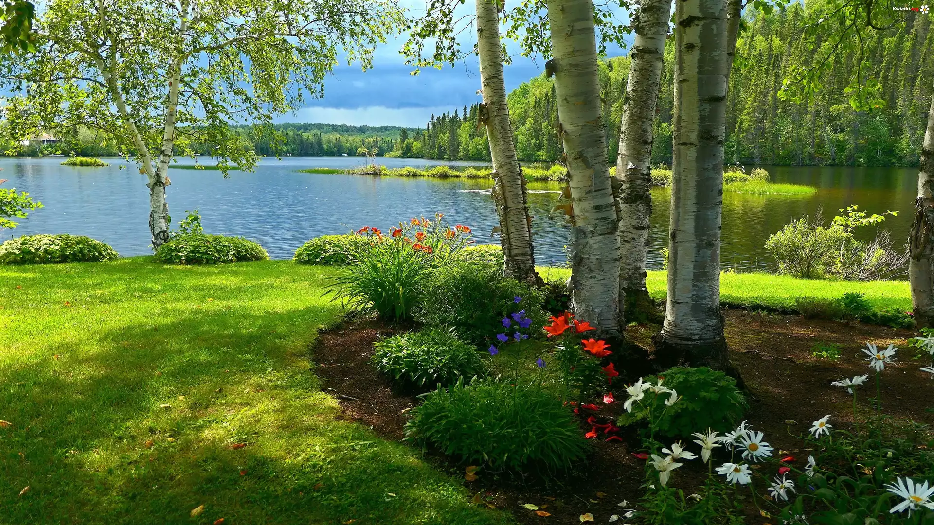 Jezioro, Trawa, Liście, Drzewa, Brzozy, Kolorowe, Kwiaty, Rabatka - Zdjęcia