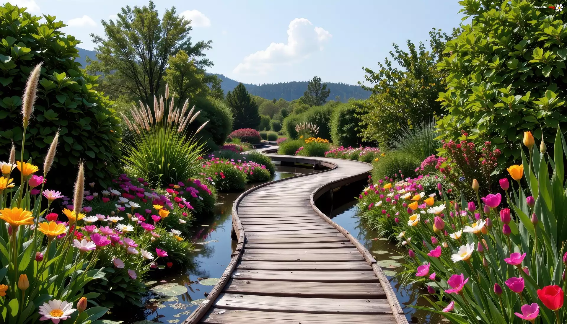 Ogród, Kładka, Kwiaty, Trzciny, Drzewa, Lato, Grafika - Zdjęcia