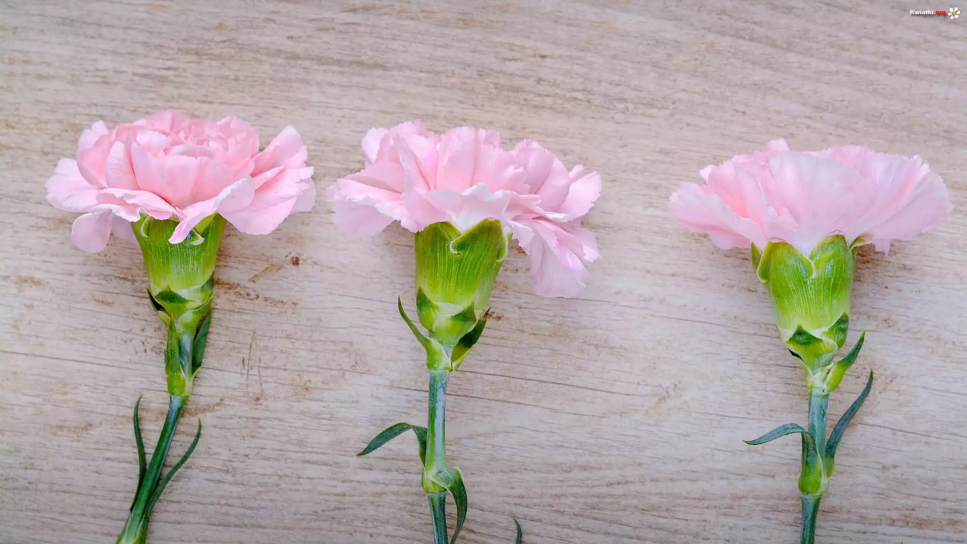 Trzy, Jasnoróżowe, Goździki, Drewno - Zdjęcia
