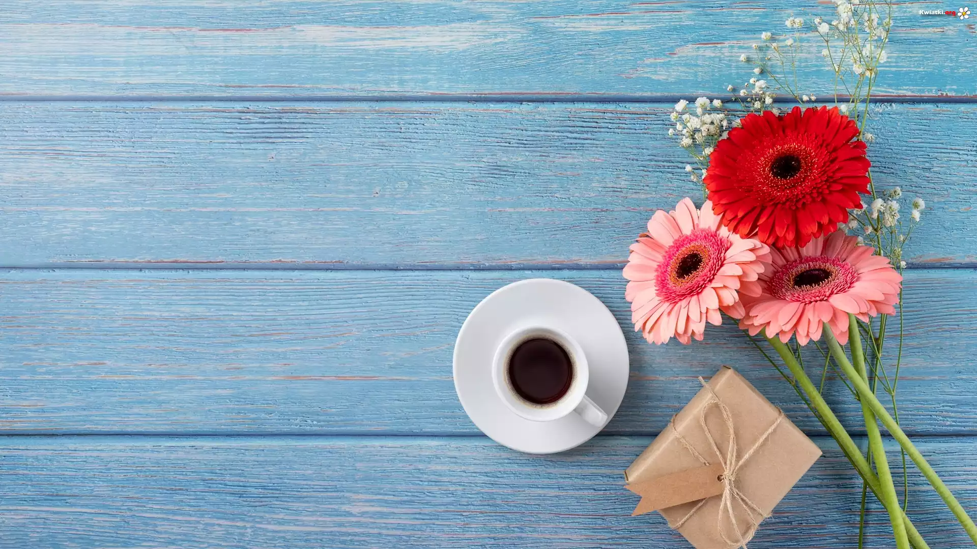 Kwiat Trzy, Gerbery, Prezent, Kawa, Deski
