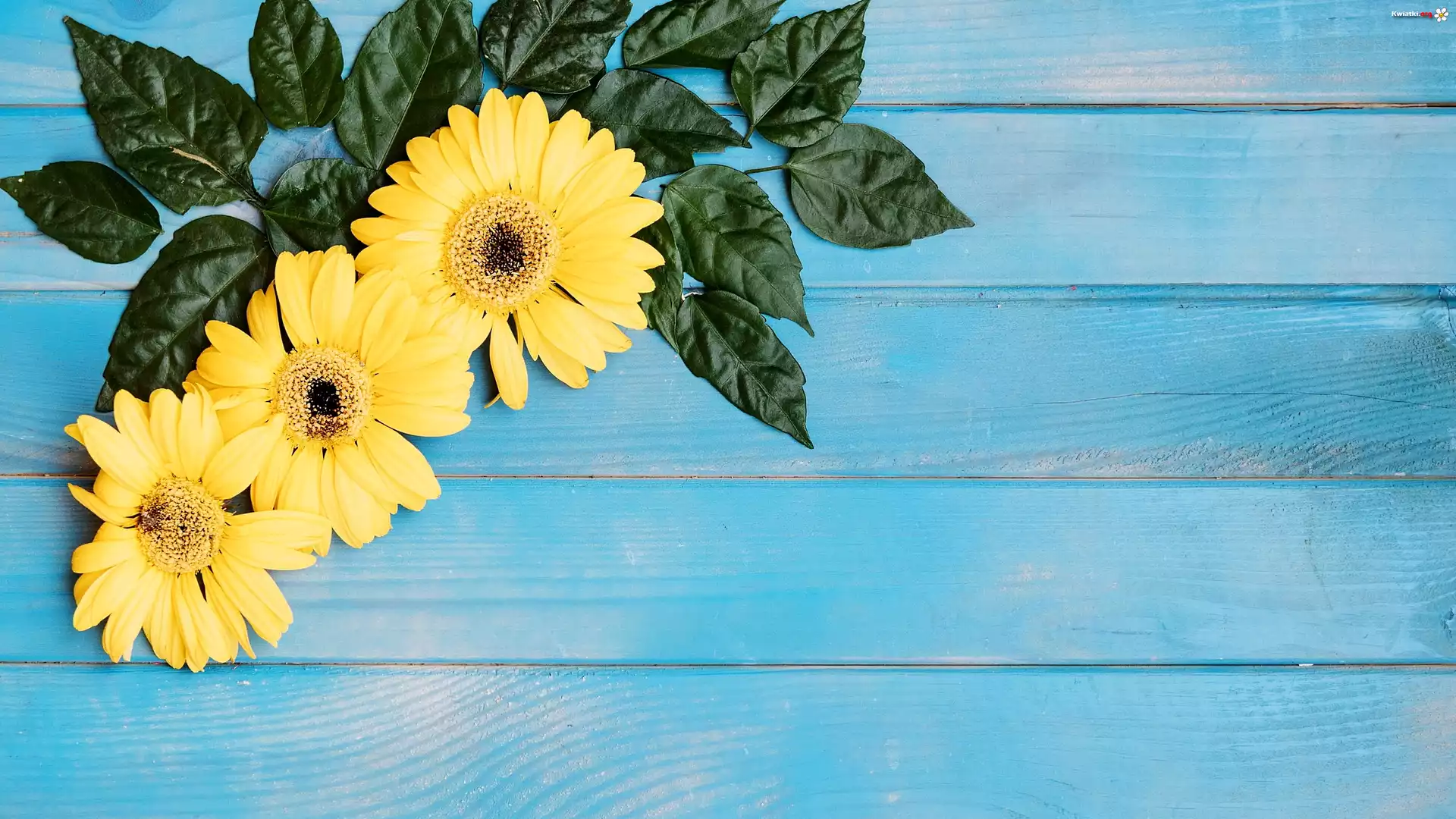 Kwiat Trzy, Żółte, Gerbery, Liście, Niebieskie, Deski