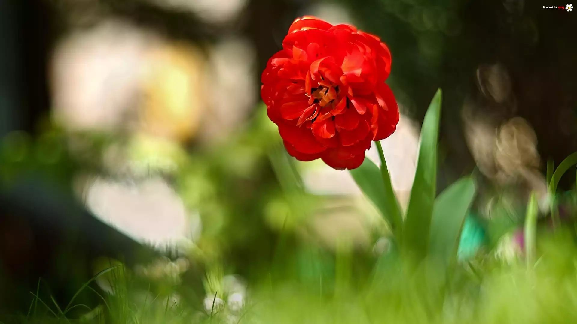 Kwiat, Tulipan, Czerwony, Trawa, Rozmycie - Zdjęcia