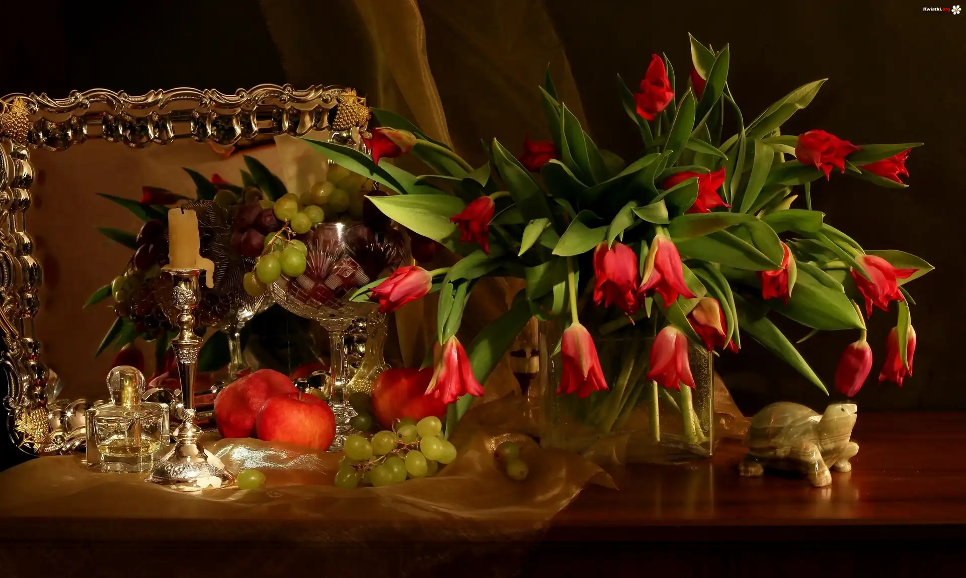 Kwiat Bukiet, Tulipany, Flakon, Winogrona, Jabłka, Lustro, Świeca