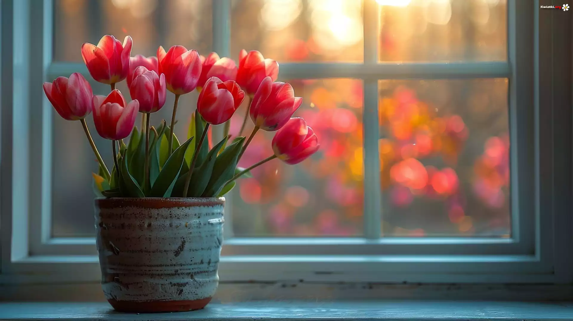 Kwiaty, Tulipany, Czerwone, Doniczka, Okno - Zdjęcia