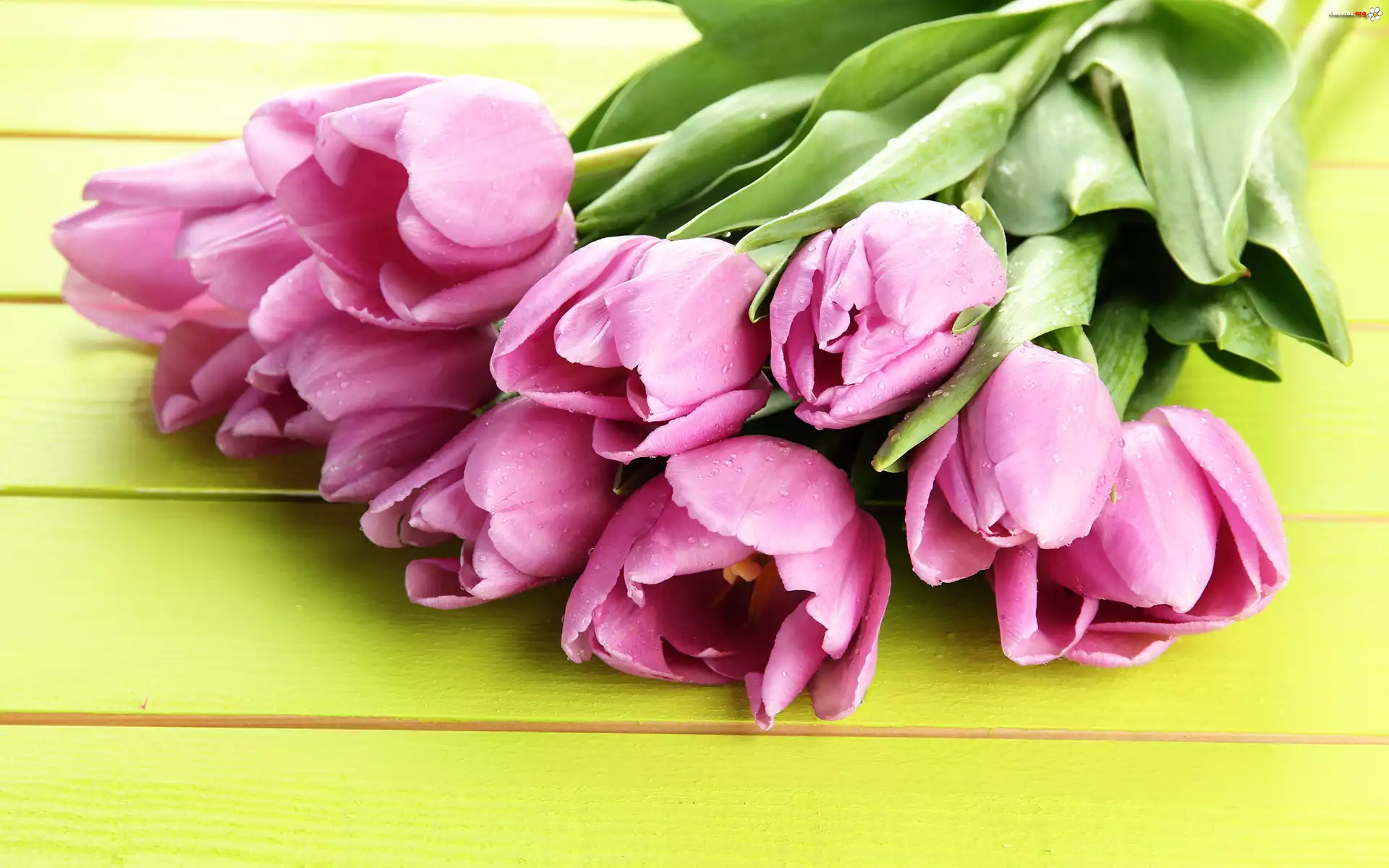 Kwiat Bukiet, Kwiaty, Różowe, Tulipany, Żółte, Deski