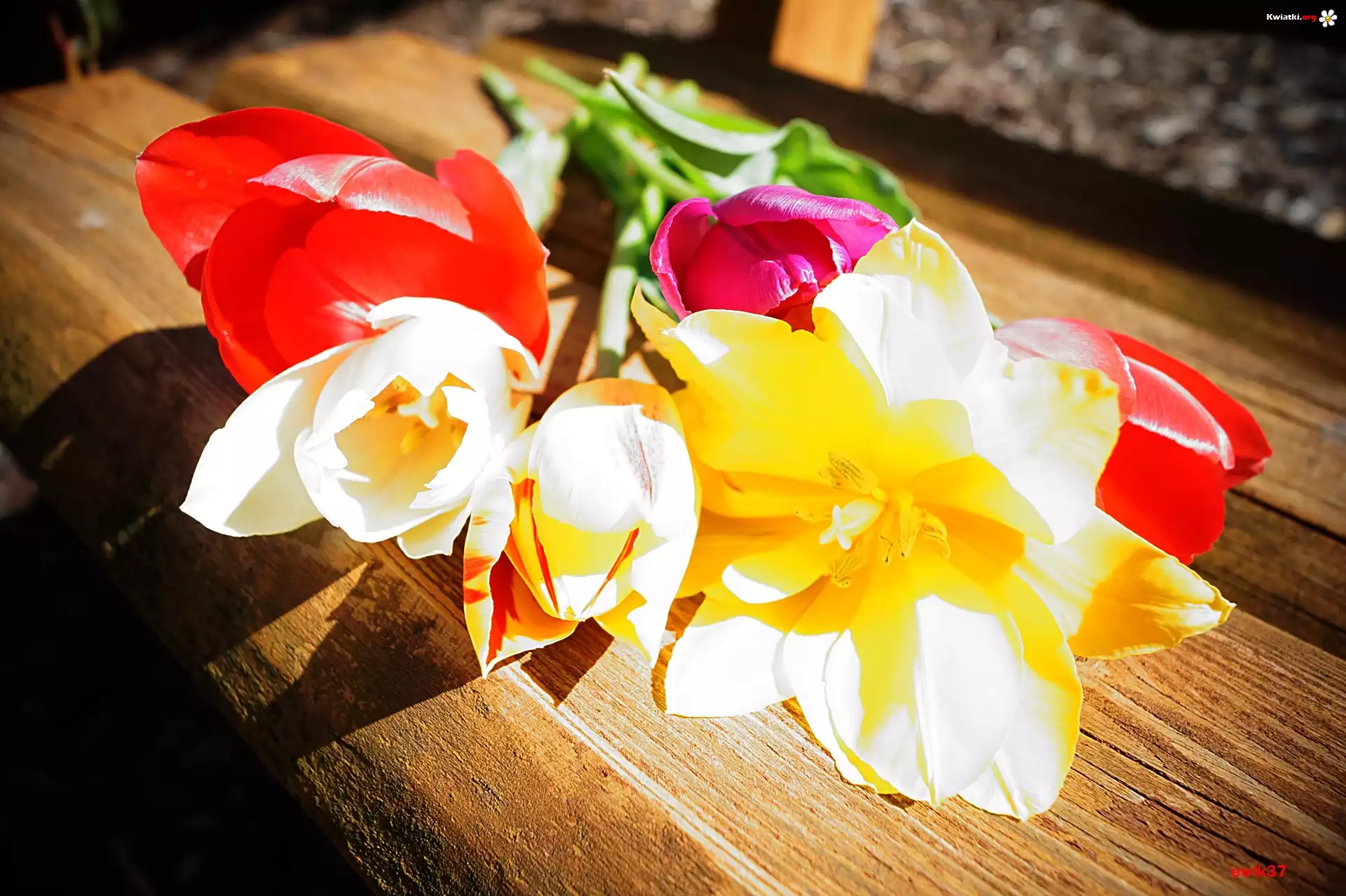 Kolorowe, Tulipany, Ławeczka - Zdjęcia