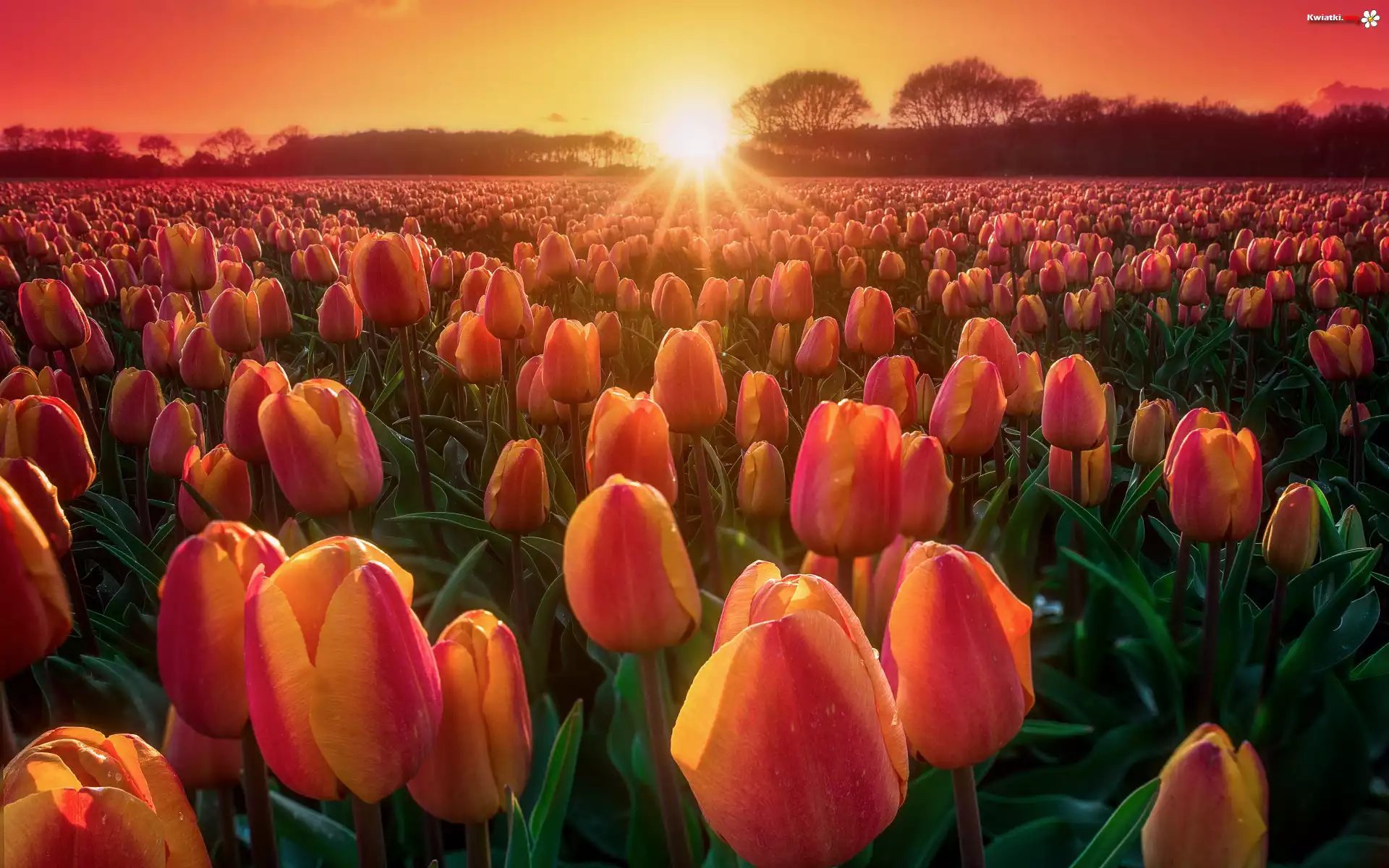 Kwiat Kolorowe, Tulipany, Pole, Plantacja, Zachód słońca, Drzewa
