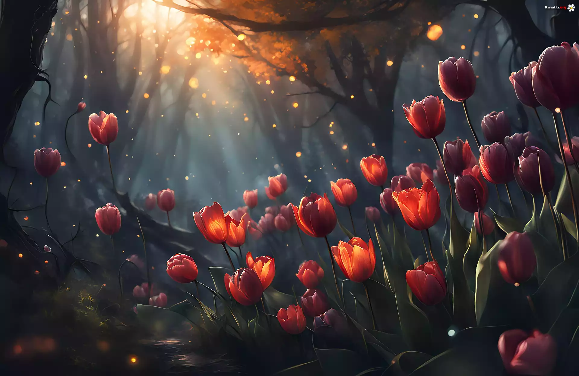 Czerwone, Tulipany, Kwiaty, Las, 2D - Zdjęcia
