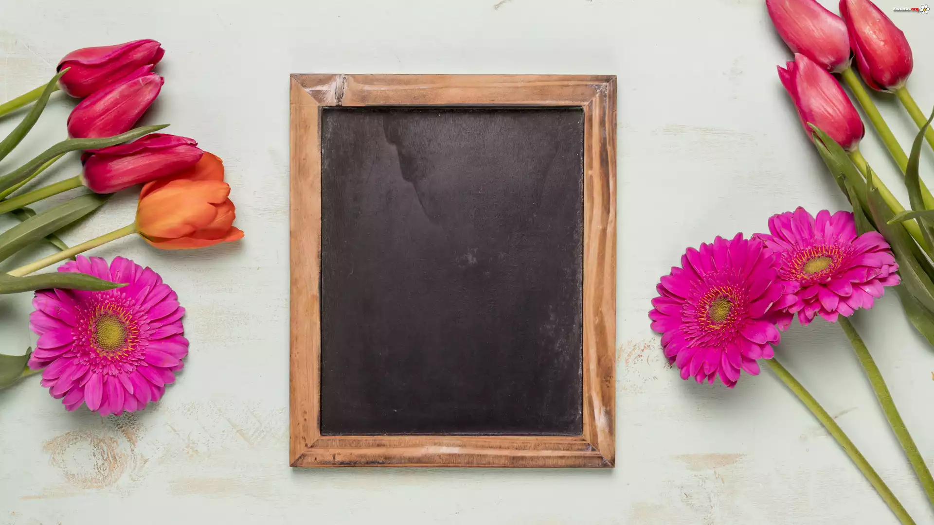 Kwiat Tulipany, Gerbery, Kwiaty, Tabliczka