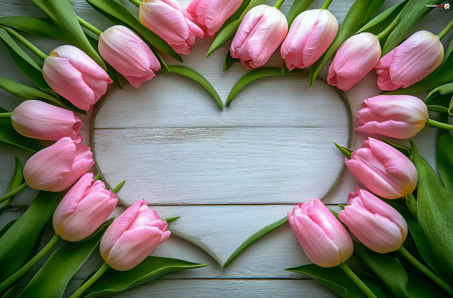 Kwiat Różowe, Tulipany, Listki, Serce, Deski