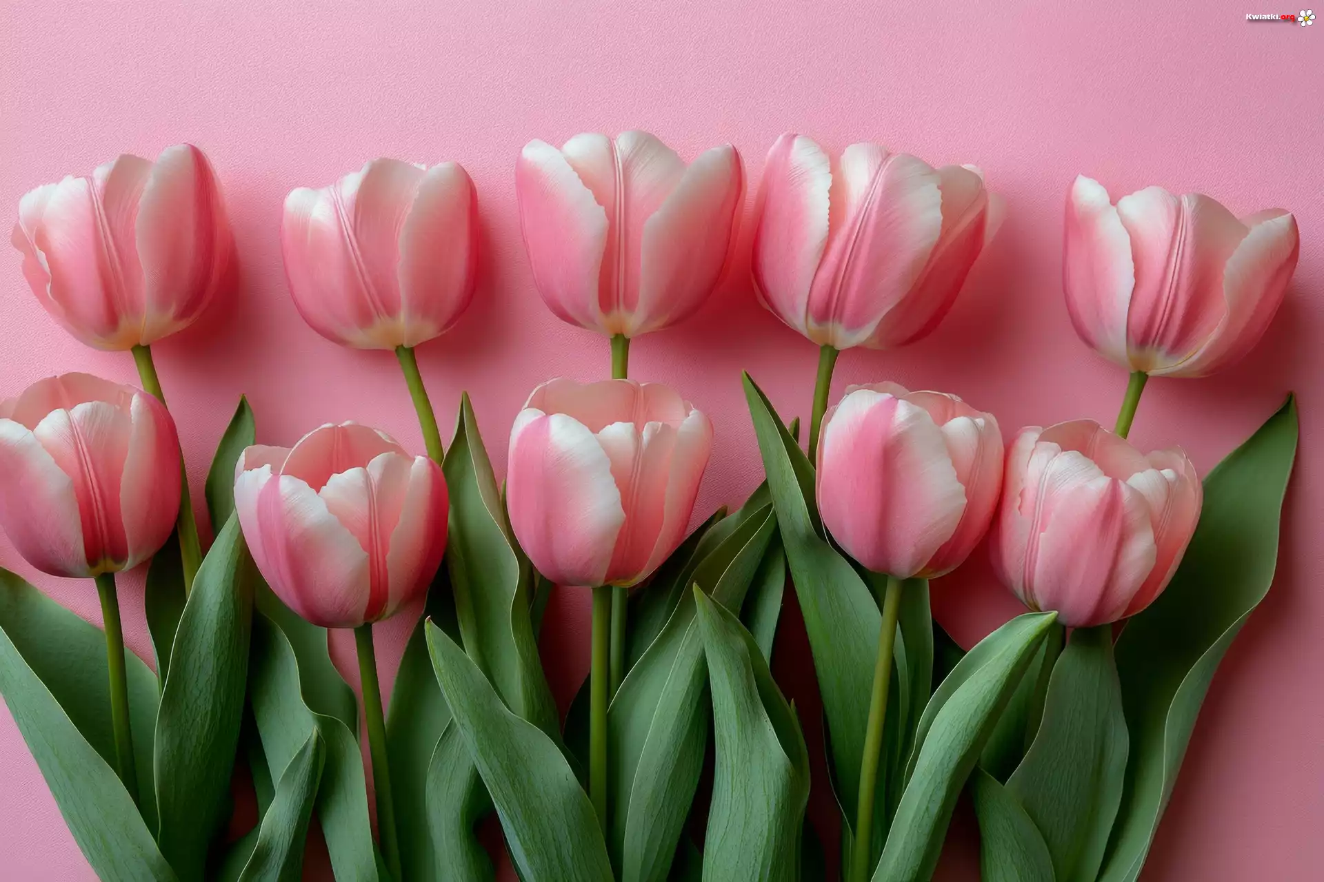 Kwiat Różowe, Tulipany, Listki, Różowe, Tło