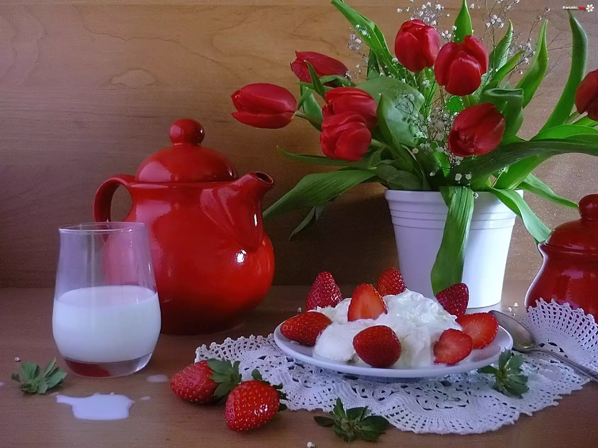 Tulipany, Truskawki, Bita, Śmietana, Mleko - Zdjęcia