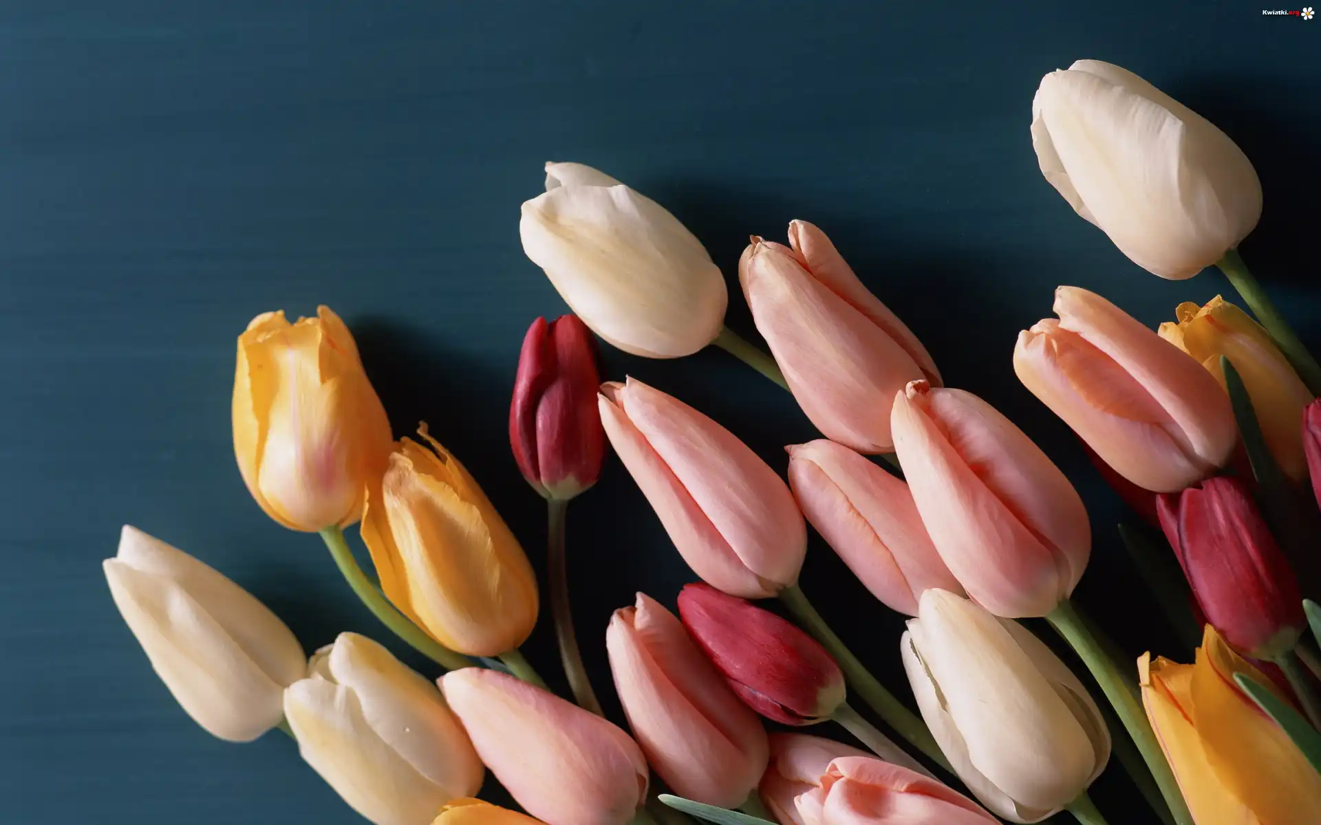 Tulipany, Kolorowe, Niebieskie, Tło - Zdjęcia