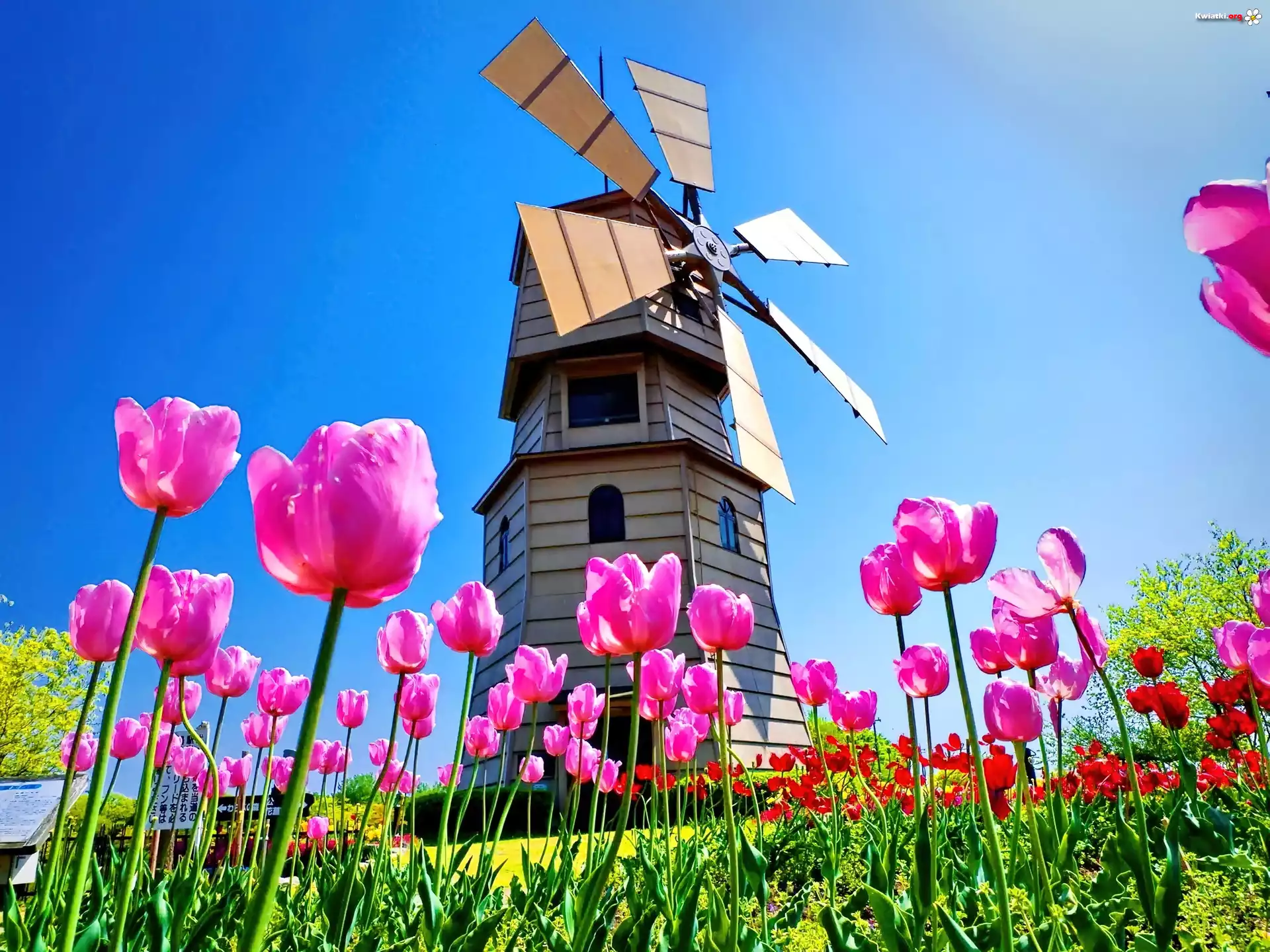 Łąka, Różowe, Tulipany, Wiatrak - Zdjęcia