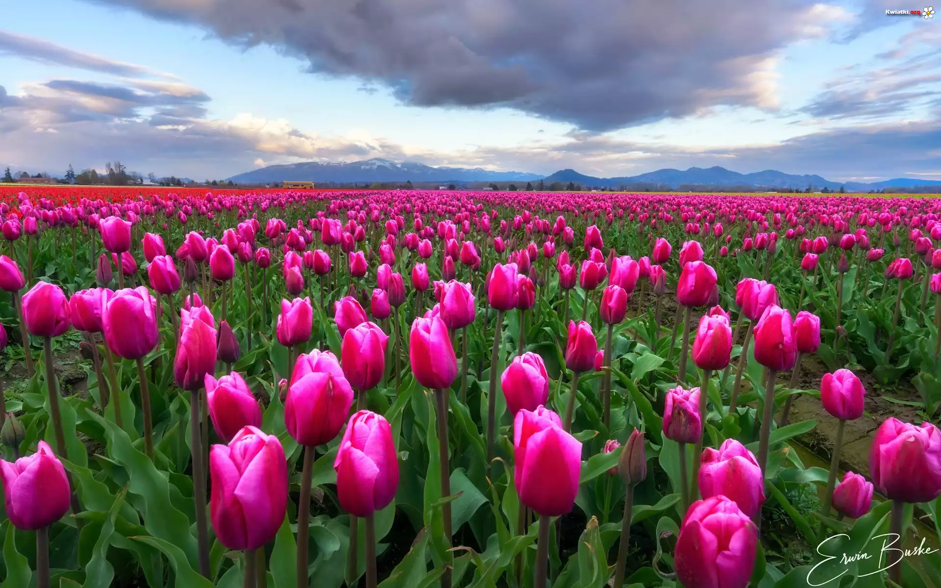 Pole, Plantacja, Różowe, Tulipany, Drzewa, Góry, Chmury - Zdjęcia