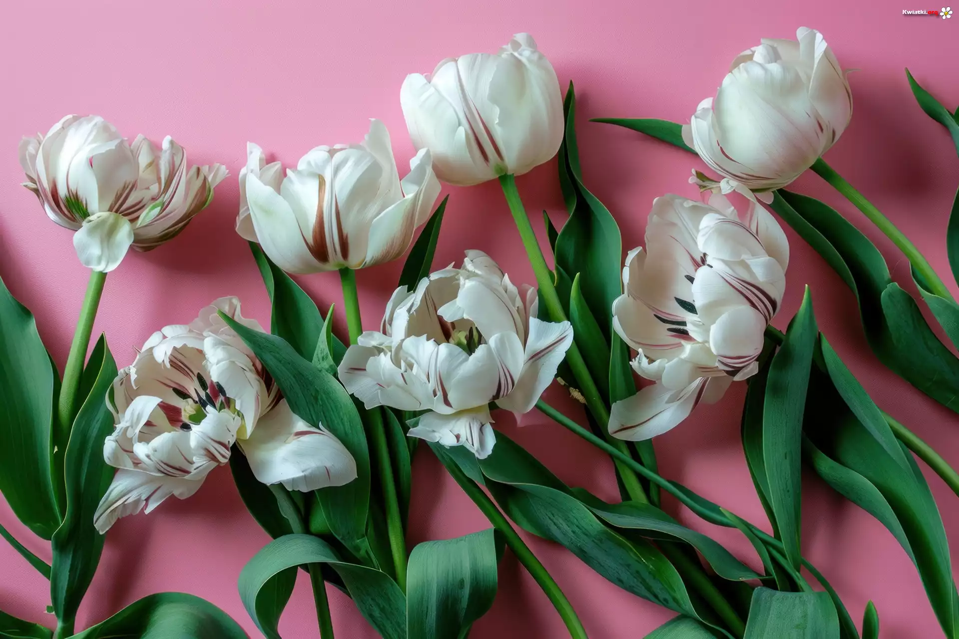 Biało-bordowe, Rozwinięte, Tulipany papuzie, Różowe, Tło - Zdjęcia