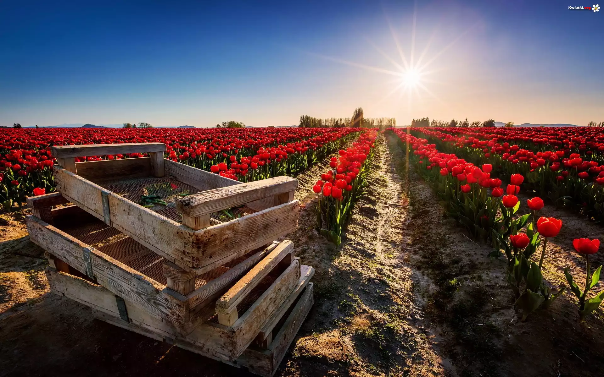 Tulipany, Pole, Promienie, Słońca, Skrzynie - Zdjęcia