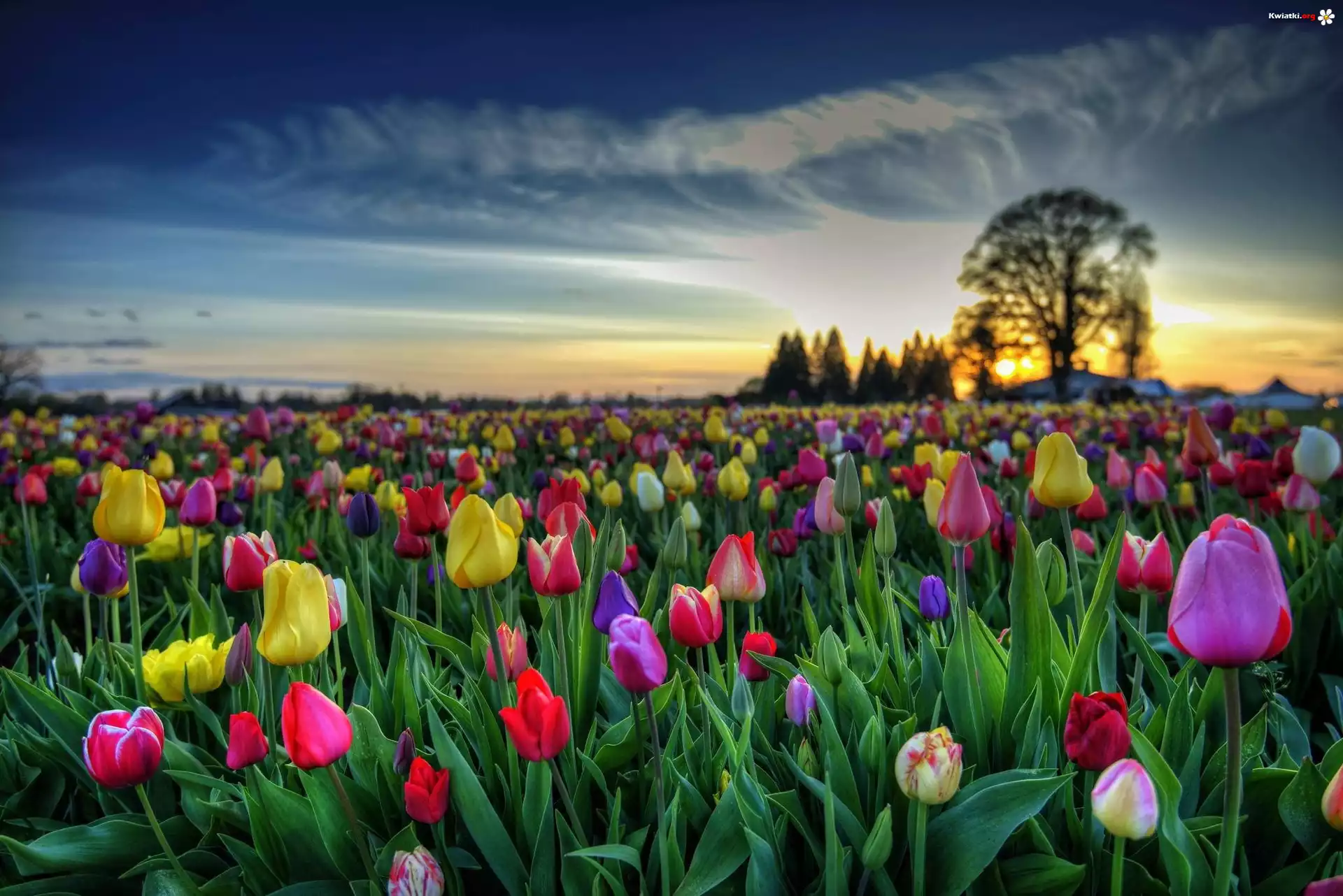 Tulipany, Zachód, Słońca, Drzewa - Zdjęcia