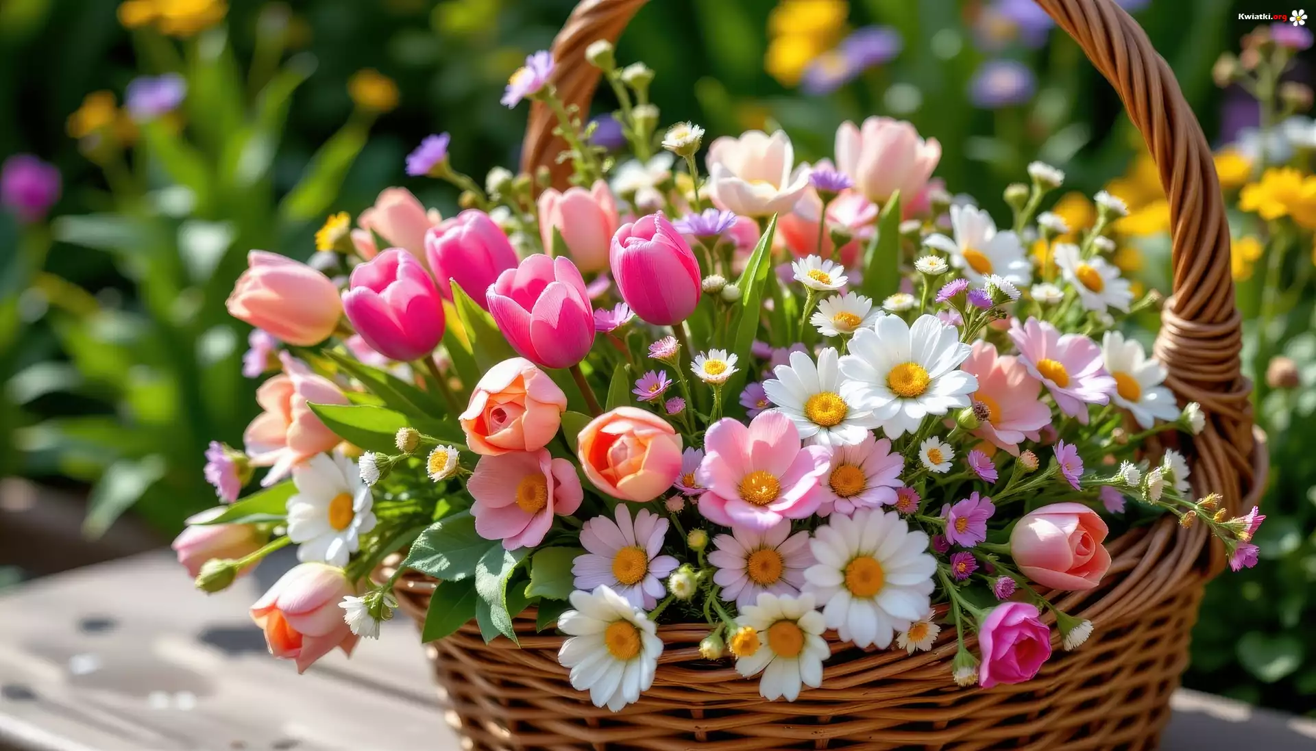 Kwiat Kwiaty, Tulipany, Stokrotki, Wiklinowy, Koszyk