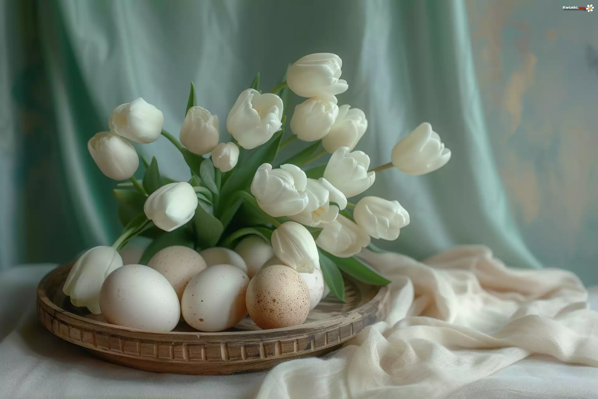 Wielkanoc, Jajka, Białe, Tulipany, Taca, Tkanina - Zdjęcia