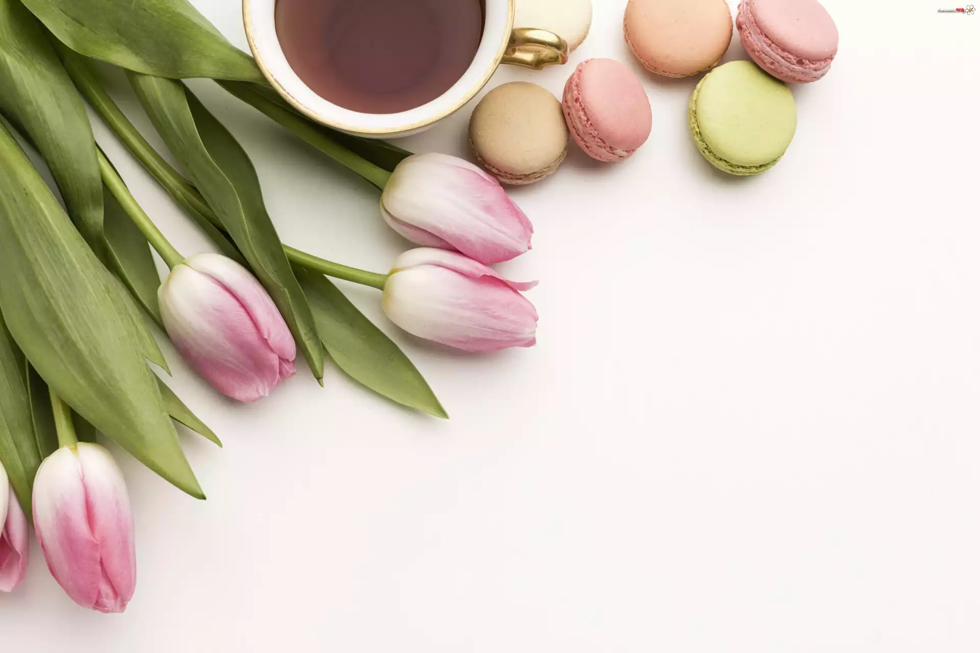 Kwiat Kwiaty, Tulipany, Filiżanka, Kawa, Ciasteczka, Makaroniki, Białe, Tło