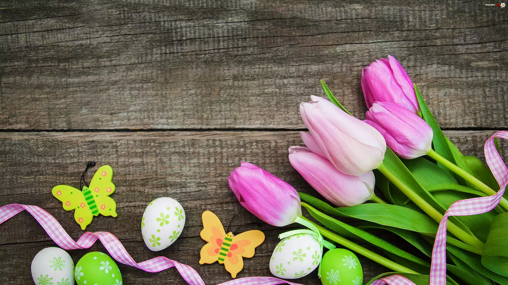 Kwiat Tulipany Motyle, Pisanki, Wstążka, Wielkanoc, Deski