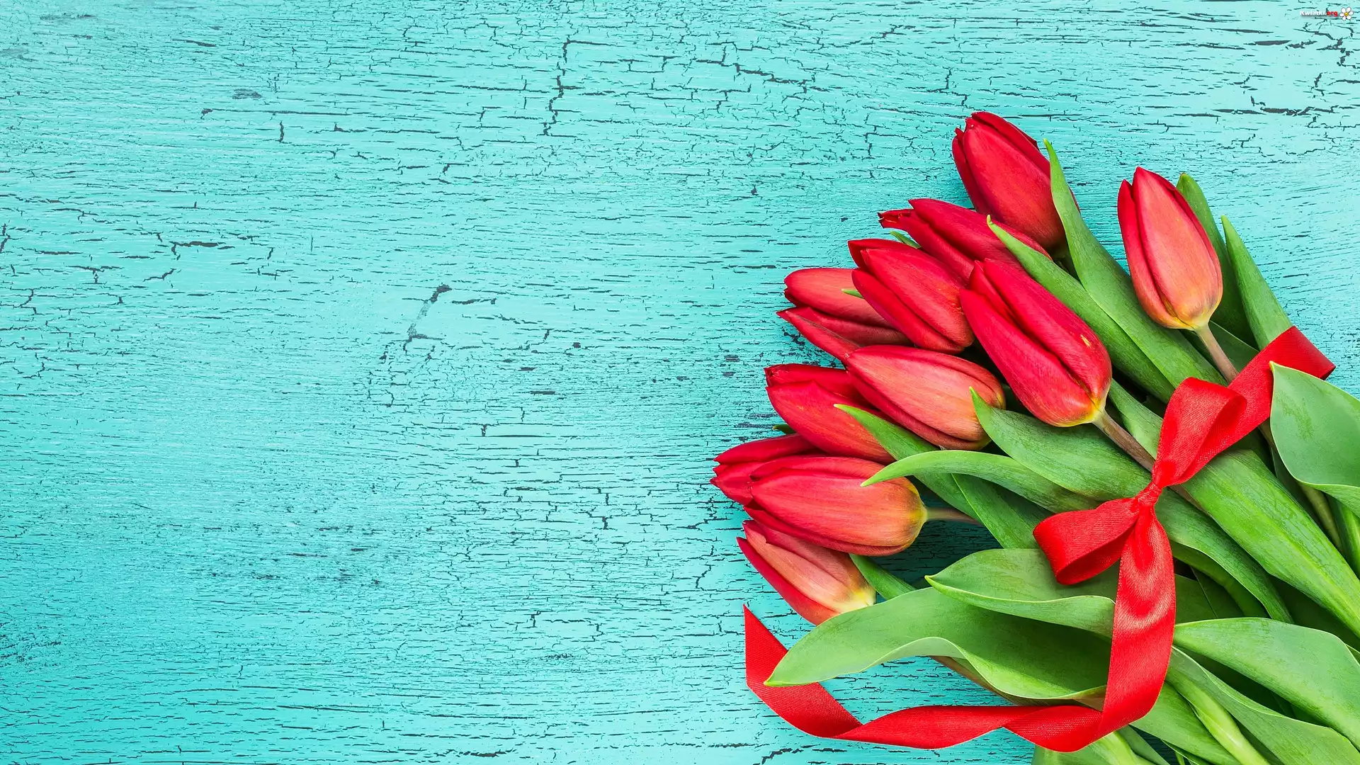 Tulipany, Czerwone, Wstążka, Bukiet - Zdjęcia