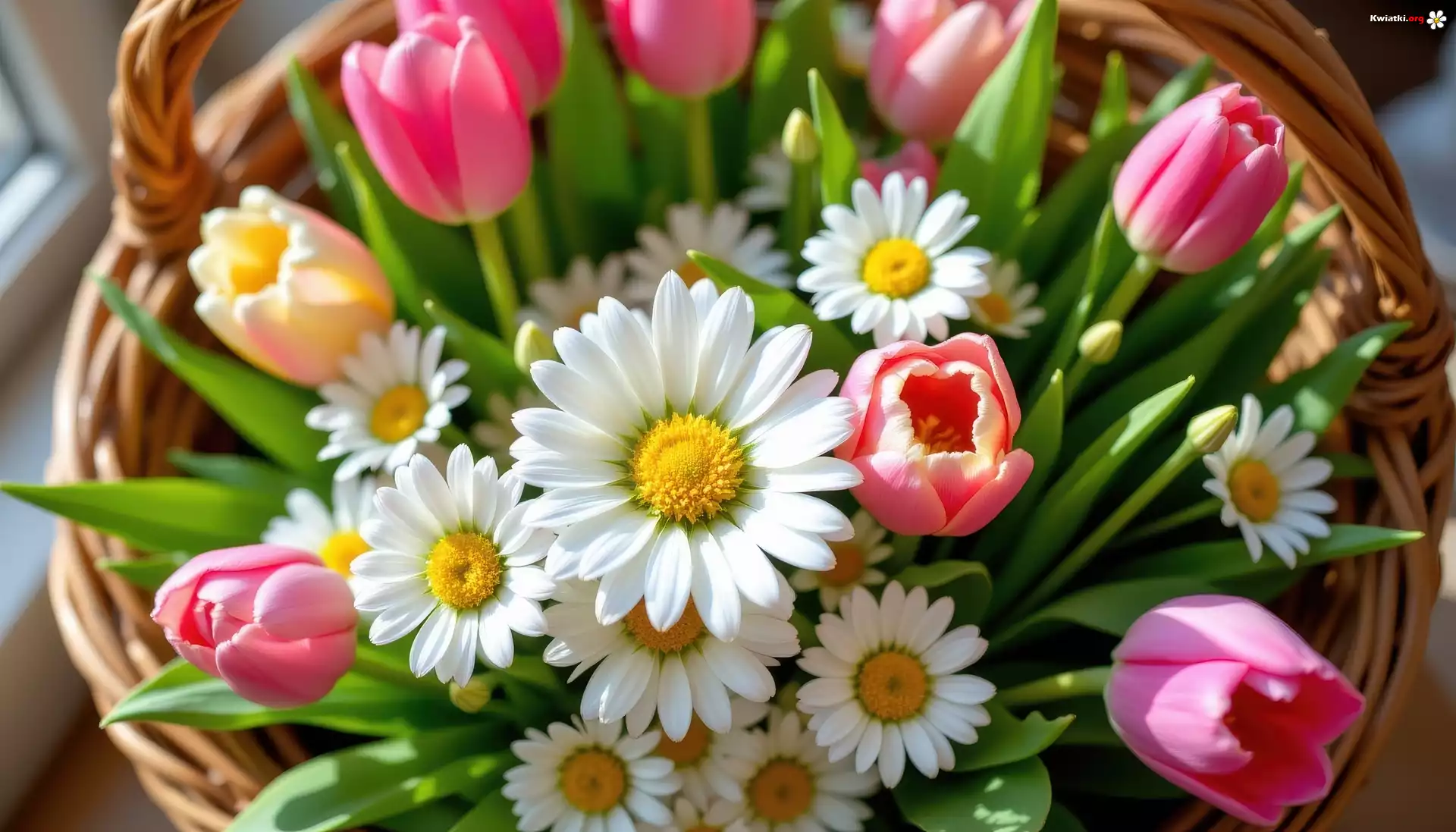 Kwiaty, Tulipany, Złocienie, Wiklinowy, Koszyk - Zdjęcia