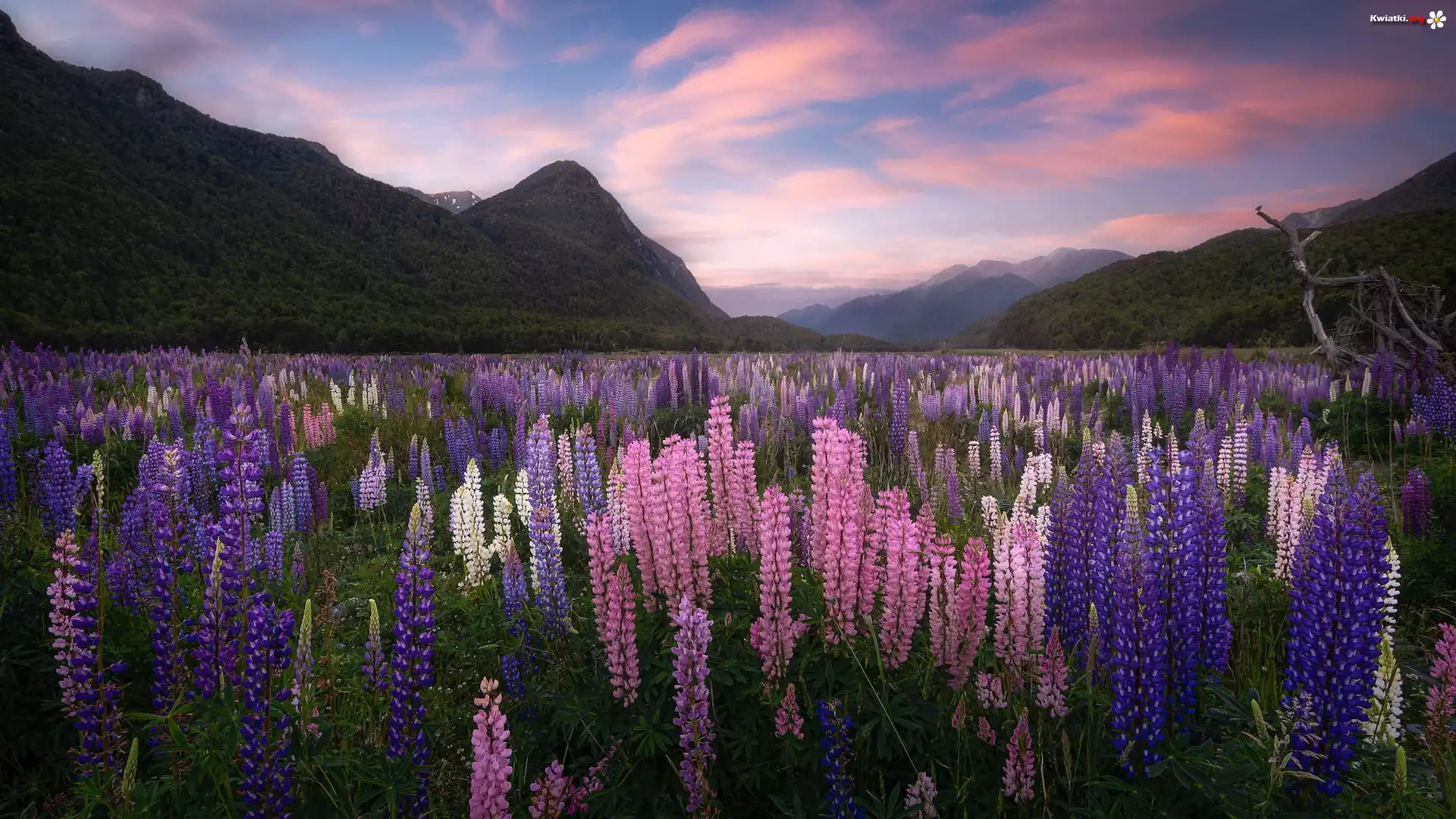 Nowa Zelandia, Region Fiordland, Góry, Dolina, Eglinton Valley, Łąka, Łubin - Zdjęcia