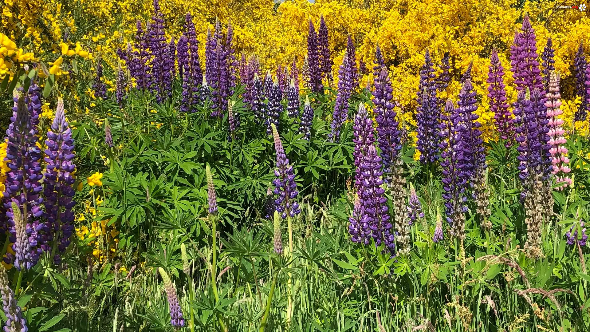 Żółte, Kwiaty, Fioletowy, Łubin, Trawa - Zdjęcia