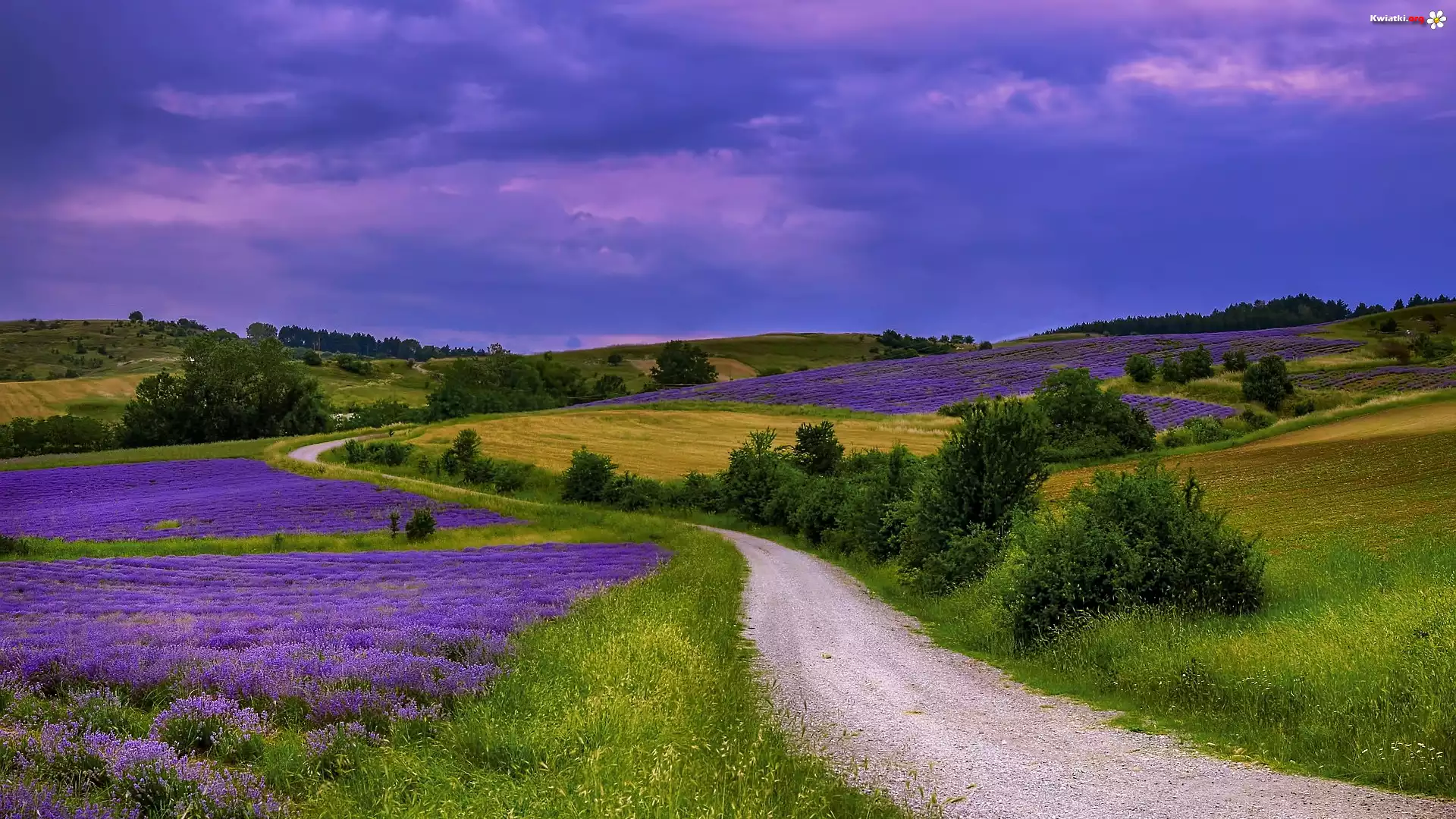 Pola, Uprawne, Łąki, Lawenda, Trawa, Krzewy, Droga, Zmierzch - Zdjęcia