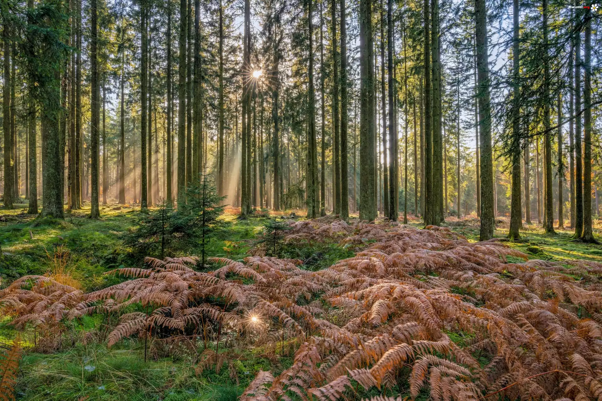 Kwiat Las, Promienie słońca, Uschnięte, Paprocie, Drzewa