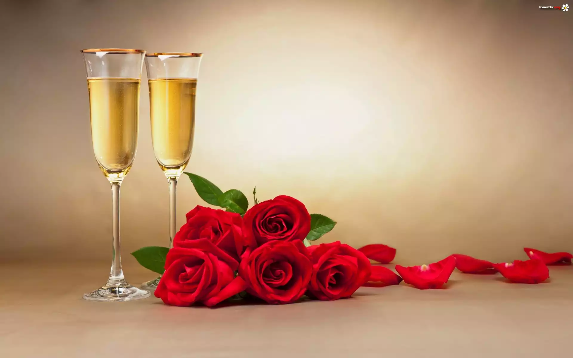 Kwiat Walentynki, Urodziny, Kieliszki, Szampan, Czerwone, Róże