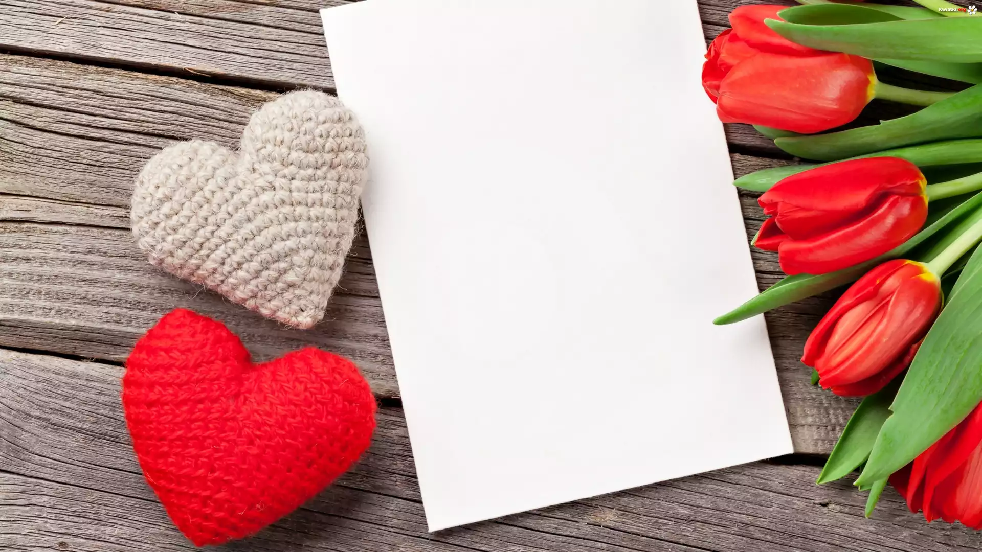 Kwiat Walentynki, Serduszka, Kartka, Czerwone, Tulipany, Deski