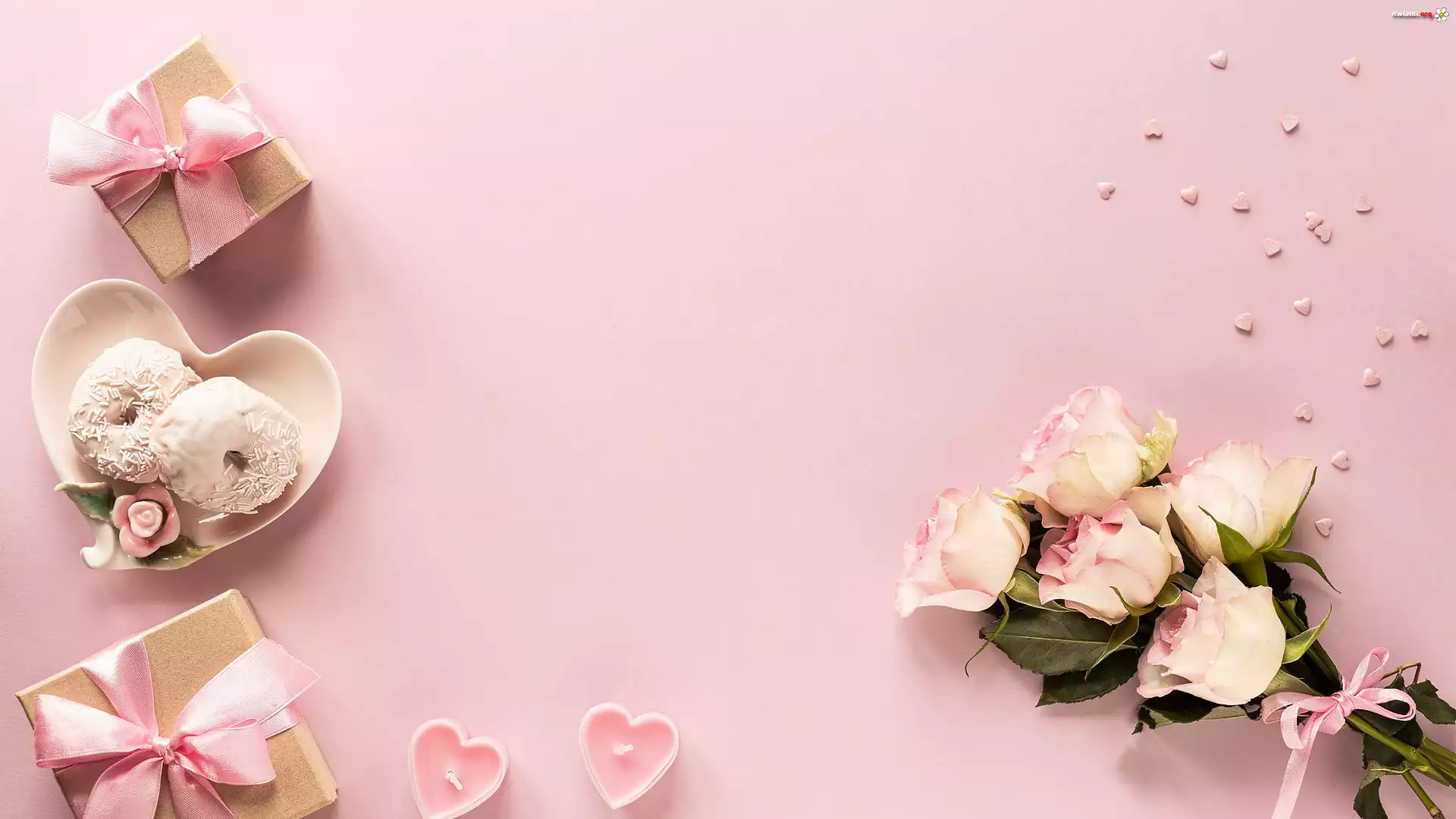 Walentynki, Prezenty, Pączki, Talerz, Świeczki, Róże - Zdjęcia
