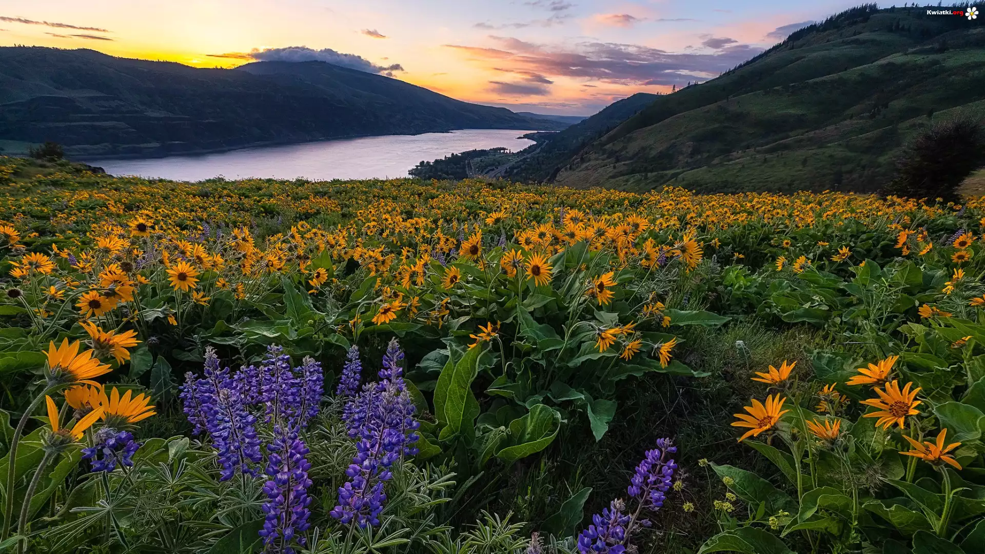 Rezerwat przyrody Columbia River Gorge, Góry Kaskadowe, Rzeka Kolumbia, Żółte, Kwiaty, Balsamorhiza, Fioletowy, Łubin, Łąka, Stan Waszyngton, Stany Zjednoczone - Zdjęcia |