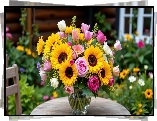 Kwiaty, Słoneczniki, Róże, Wazon, Stolik, Bukiet - Zdjęcia