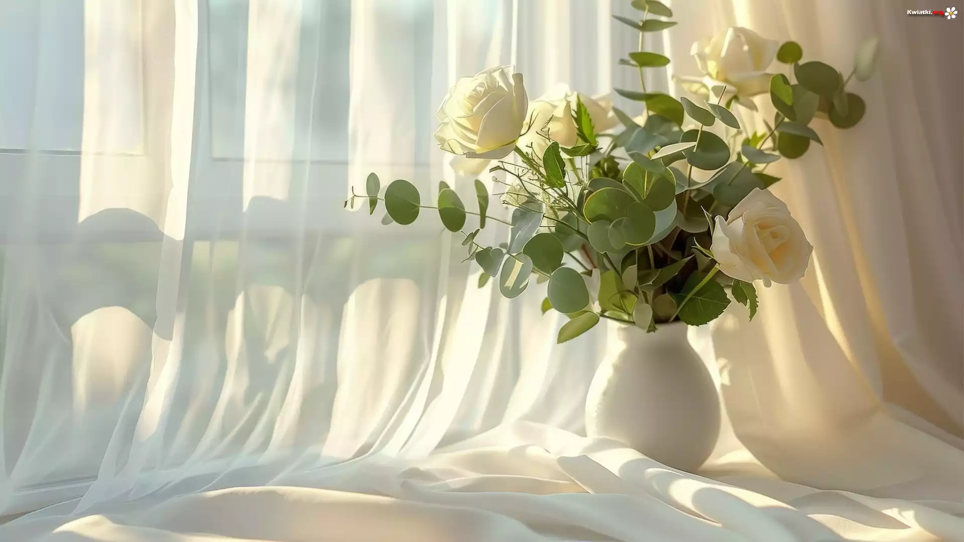 Kwiaty, Róże, Białe, Wazon, Okno, Firanka - Zdjęcia