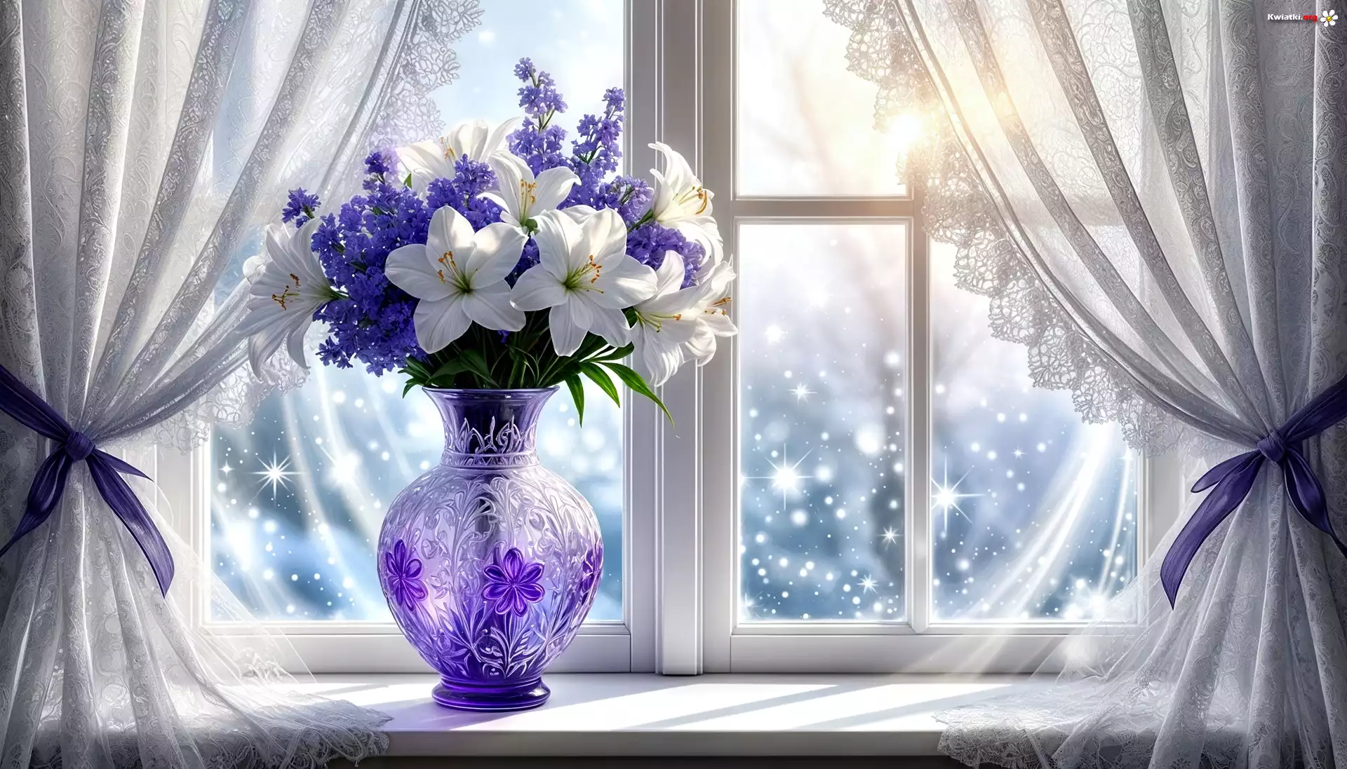 Kwiaty, Bukiet, Fioletowy, Wazon, Okno, Grafika - Zdjęcia